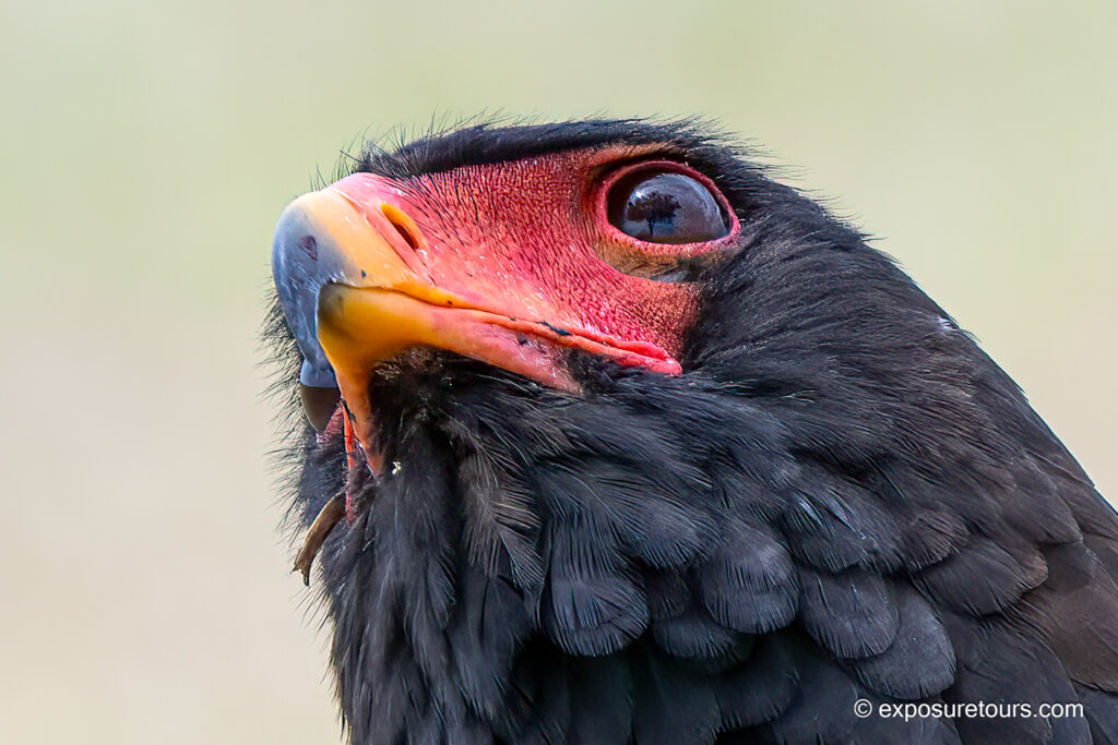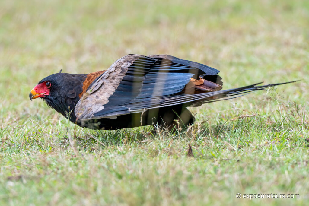 For photographers, the Bateleur offers exceptional opportunities, particularly when photographed in flight. Mid-morning to late-afternoon light works especially well to illuminate the bird’s vivid colors. At the same time, a fast shutter speed helps freeze the rocking wingbeats, while continuous autofocus improves your chances of keeping the bird sharp against busy backgrounds.