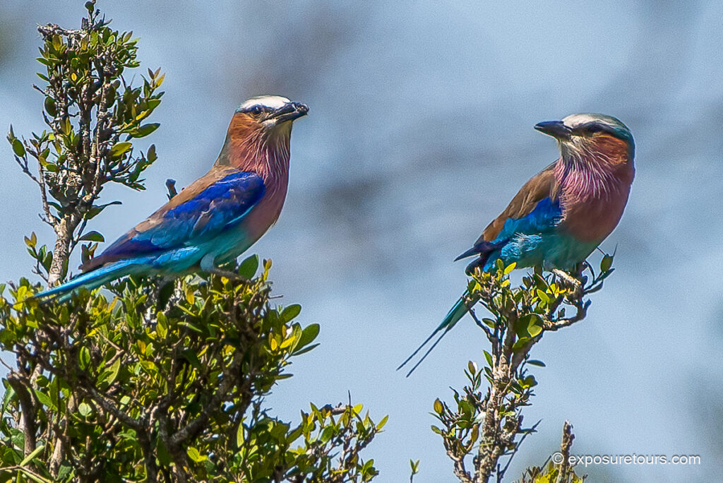 For photography, look for Lilac-breasted Rollers perched in open areas with clean, uncluttered backgrounds. Early morning and late afternoon light enhances their iridescent plumage. It also helps reduce harsh shadows. Use a fast shutter speed to capture them in flight during hunting dives or display flights. When possible, position yourself at eye level.