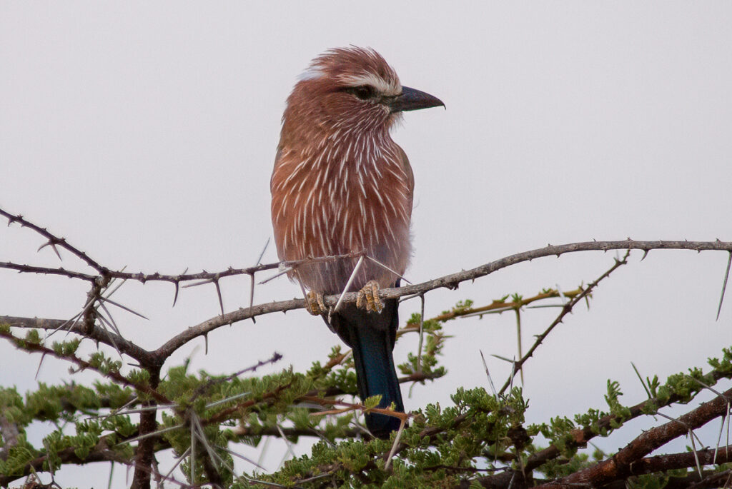 Purple Rollers are outstanding subjects for wildlife photography due to their bold colors and relatively tolerant behavior. A telephoto lens of 300–400mm works well for perched portraits, while faster shutter speeds help freeze their dynamic flight when hunting.