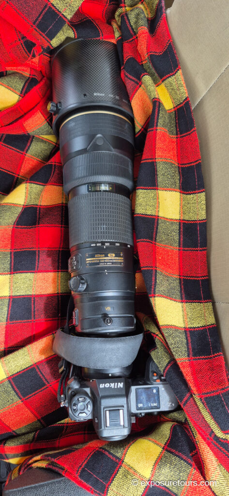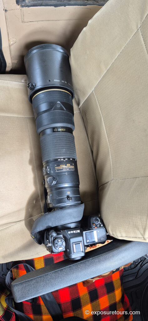 The seat beside me almost feels custom-built for the Z9 paired with the 200–400mm f/4. It’s padded on all sides and fits neatly between the door frame and the armrest. First, I place it on a blanket, which not only supports the setup but also helps reduce dust. Then, I add a bean bag on top, which provides extra weight and stability, keeping everything secure while shooting.